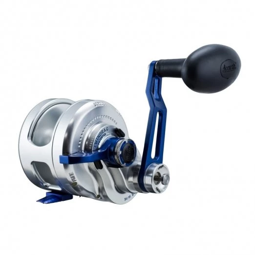 Accurate BX2 Boss Extreme Series II 2-Speed Lever Drag Reels are available in several sizes. They are silver/blue in color.