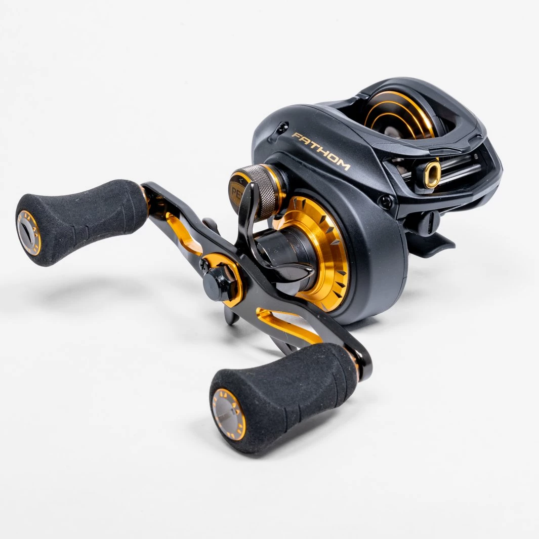 Penn Fathom Low Profile Baitcasting Reels are available in 200, 300 and 400 sizes. The 200 and 300 have a double paddle handle while the 400 features double EVA ball power knobs. The low gear ratio models are black and gold while the high gear ratio models are black and red.