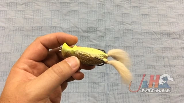 The Deps Buster K Frog is half frog, half popper. It has a large cupped mouth that produces a lot of commotion on the surface of the water and causes nearby fish to strike. The hollow body is easily compressed to expose the heavy-duty super sharp Deps original outbarb hooks and willl lead to more hookups. At the back are a pair of rabbit tail legs that produce a unique action in the water. Inside is a rolling ball that helps you get good distance on your casts but also rattles as it swims and adds another element to get fish to bite. Give a Deps Buster K Frog a try and you will love it. Add one to your arsenal of frogs.