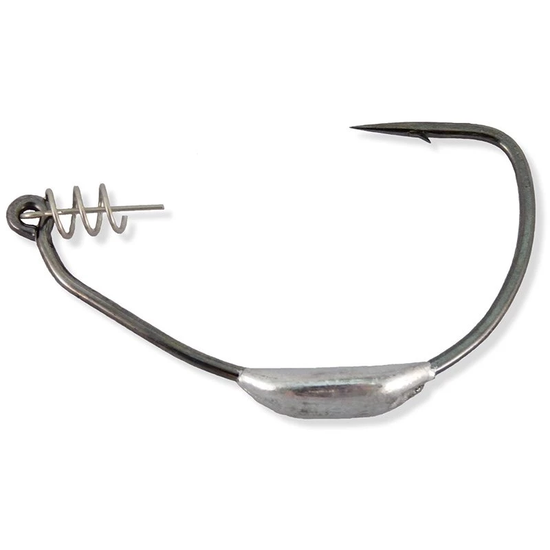Owner Weighted Beast Hooks with Twistlock are designed for fishing large soft plastics. These super sharp hooks feature a wide gap design with a weight built into the hook. The weight is positioned beneath the bait and acts like a keel to keep the swimming action intact, at all depths. Unlike a nail weight that you insert directly into the bait, this weight does not alter the swimming action. Owner Weighted Beast Hooks with Twistlock feature a centering pin spring that you insert into the nose of the bait, keeping it secure and perfectly lined up. These high-carbon steel hooks are xxx-strong. If you’re fishing with soft plastics and need to get the bait down without sacrificing on presentation, get yourself some Owner Weighted Beast Hooks with Twistlock. The design is weedless.