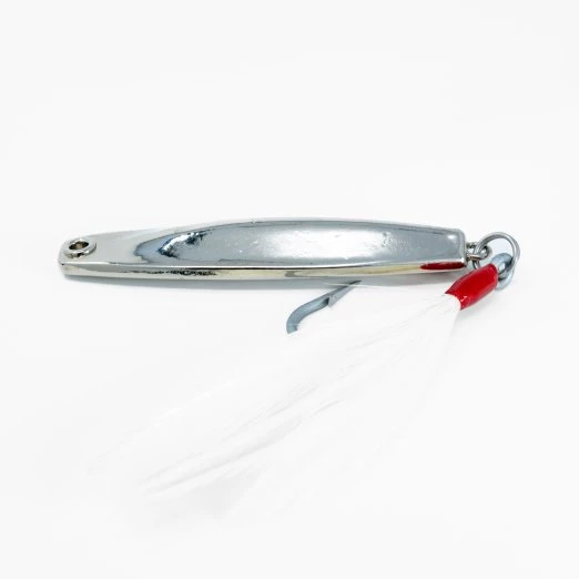 Charlie Graves Swimming Tins are a great surfcasting lure! These tins have been around forever and anglers continue to use them because they are extremely effective! Charlie Graves Swimming Tins are constructed of block tin with a chrome finish. They use a strong stainless steel split ring to attach a single hook w/ feathers to the back of the lure. Charlie Graves Swimming Tins have a built-in keel so instead of flipping and rolling, they actually swim and do a great job of imitating a baitfish. Their shiny exterior reflects a lot of light and the motion of the feathers makes hungry fish strike. If you are fishing from the beach and want to catch more fish, tie a Charlie Graves Swimming Tin to your line and see what happens. They are very castable.