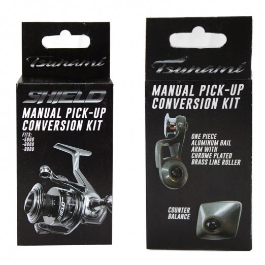 Tsunami Shield Manual Pick-Up Conversion Kits come with a line roller and a counter balance. They fit the 5000, 6000 and 8000 spinning reels. Easy to install!