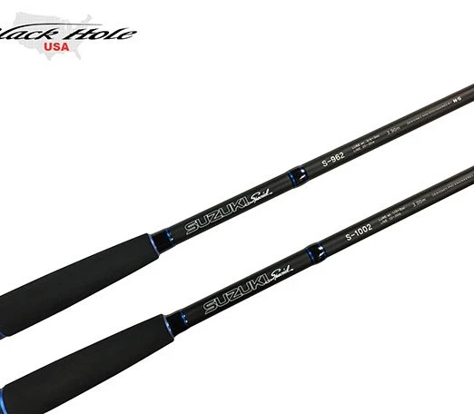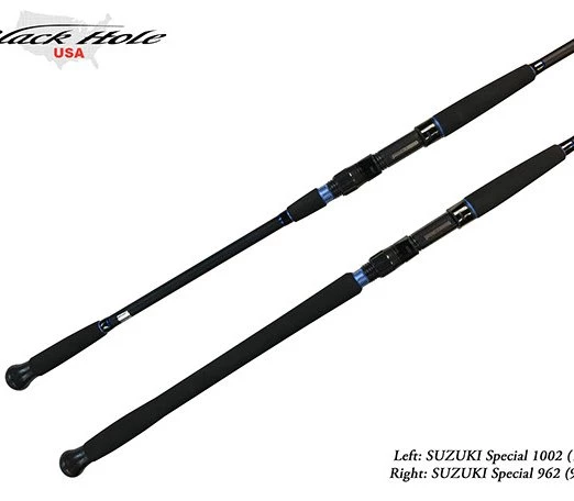 Black Hole USA Suzuki Special Surf Spinning Rods are available in 9’6″ and 10′ models. They are black with blue accents. We like pairing it with a Van Staal VR50, b chameleon finish will turn heads on the beach. They are 2-piece with a 50/50 split.